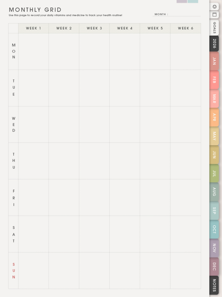 Organize your month using this grid to see all your tasks, deadlines, and events at a glance.