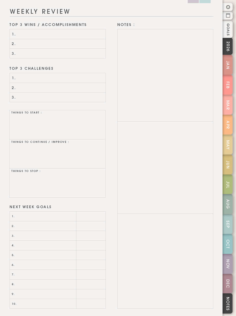 Reflect on your week with space to evaluate achievements, challenges, and areas for improvement.