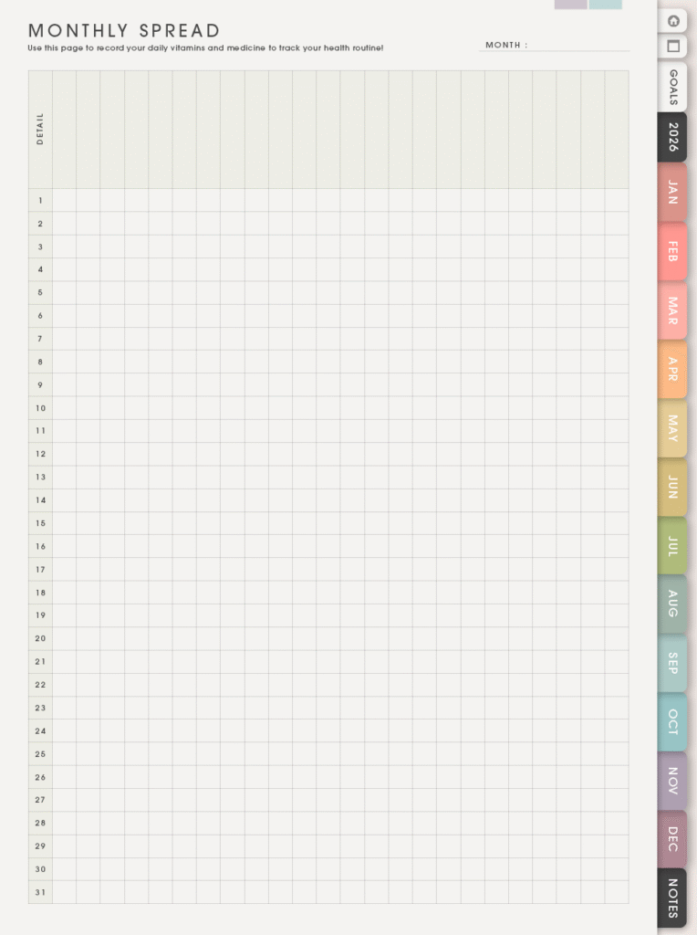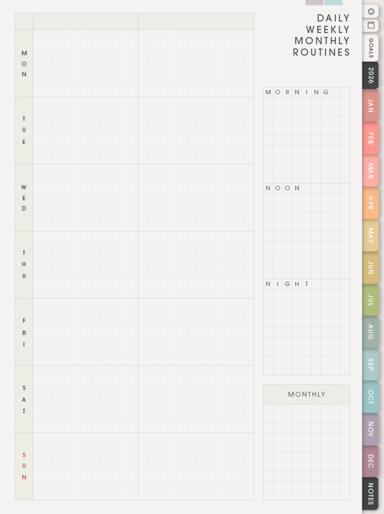 A detailed view of the entire month with space to plan, jot down reminders, and track progress.