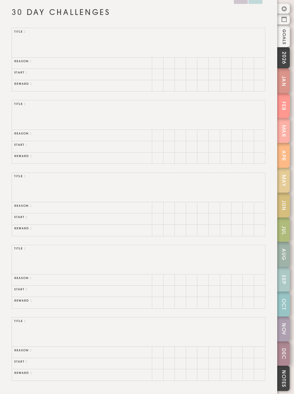 Commit to a 30-day challenge with a dedicated space to log daily progress and reflections.