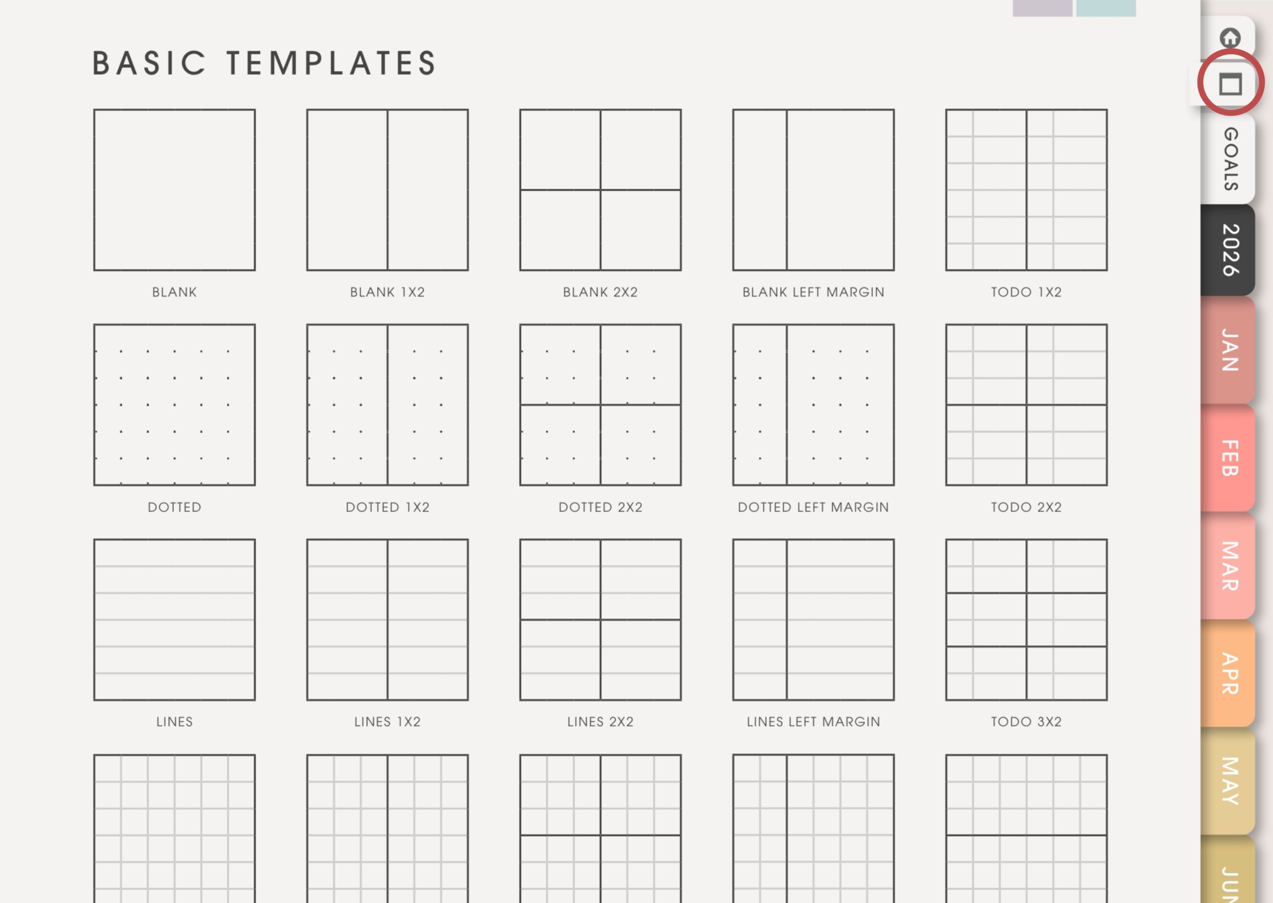 Tap the Template icon on the top-right corner (second icon) of your planner or notebook.