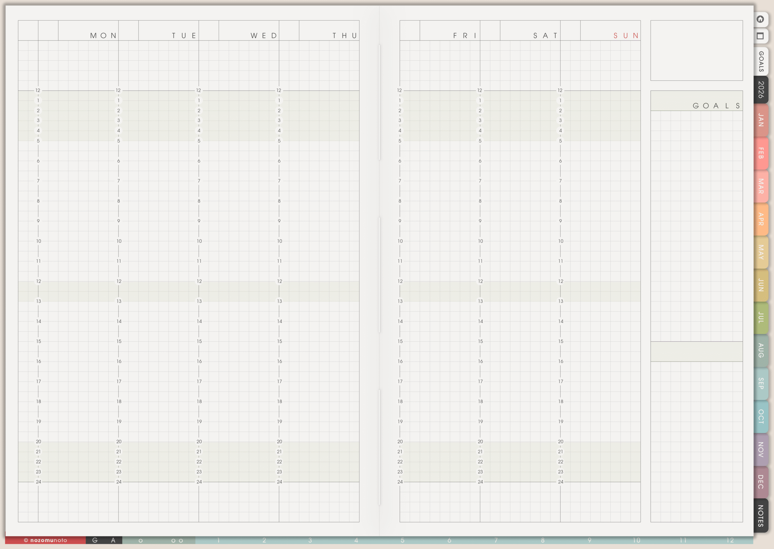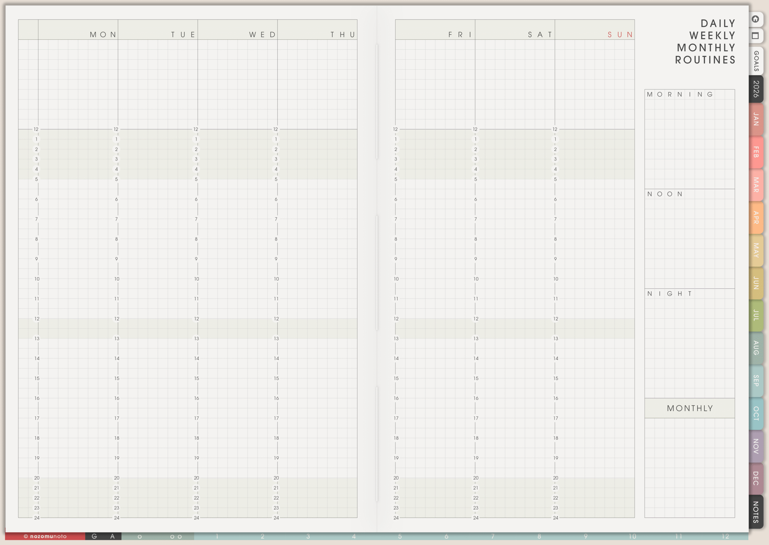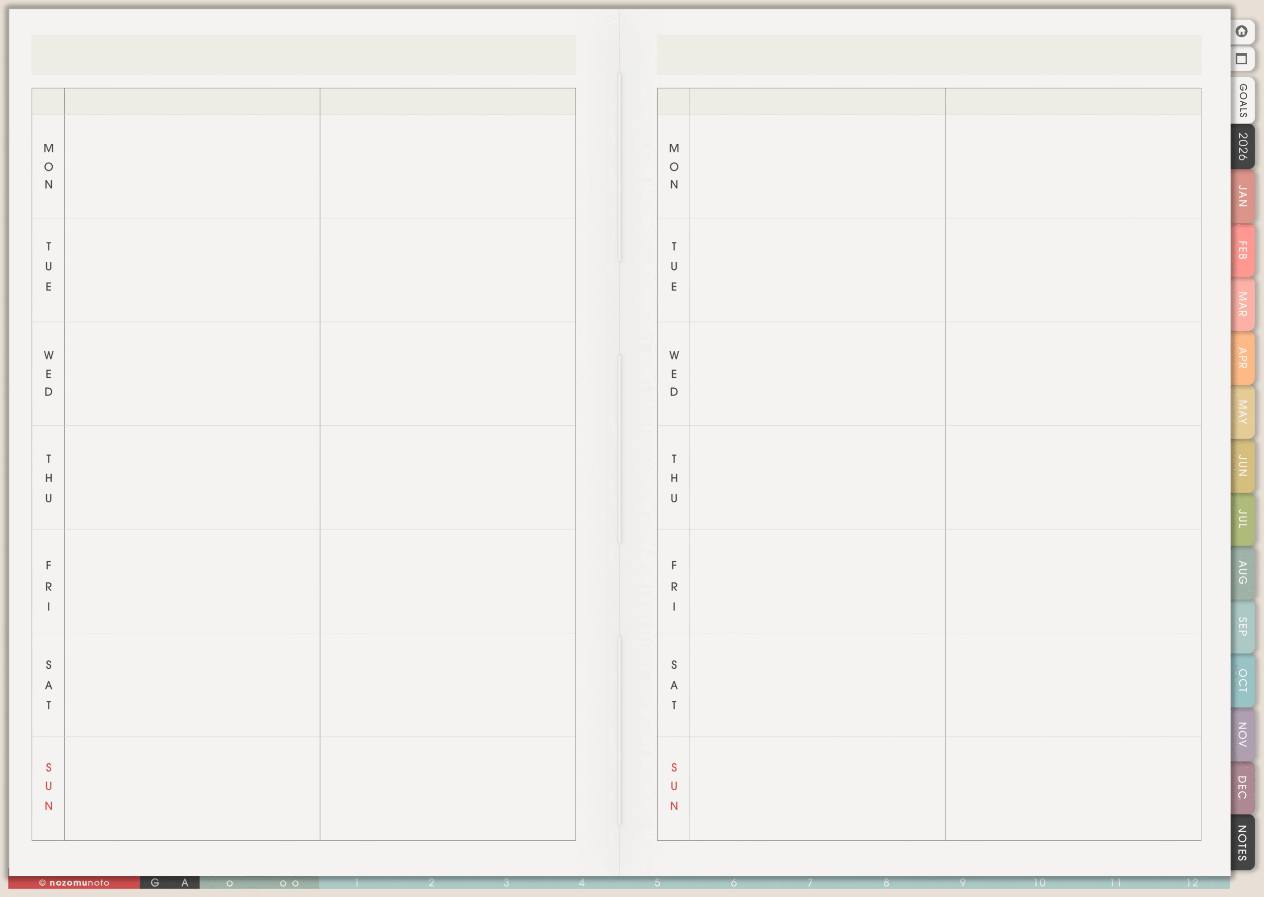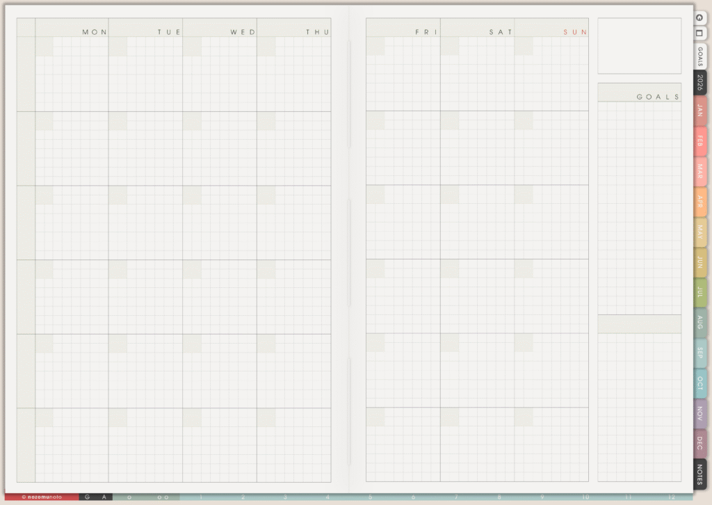 A detailed view of the entire month with space to plan, jot down reminders, and track progress.