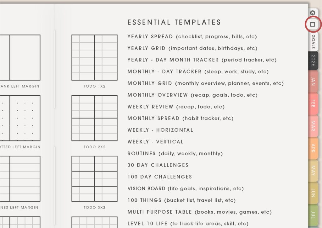 Tap the Template icon on the top-right corner (second icon) of your planner or notebook.