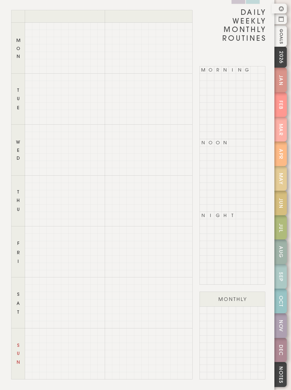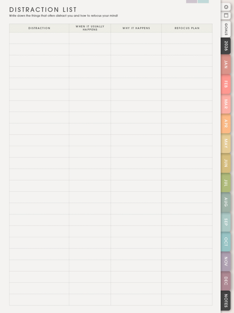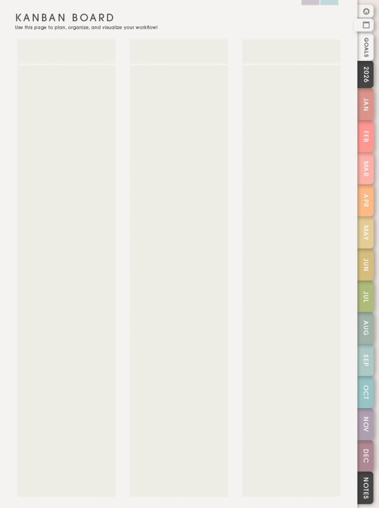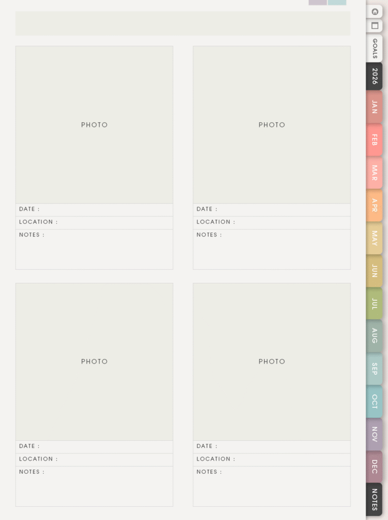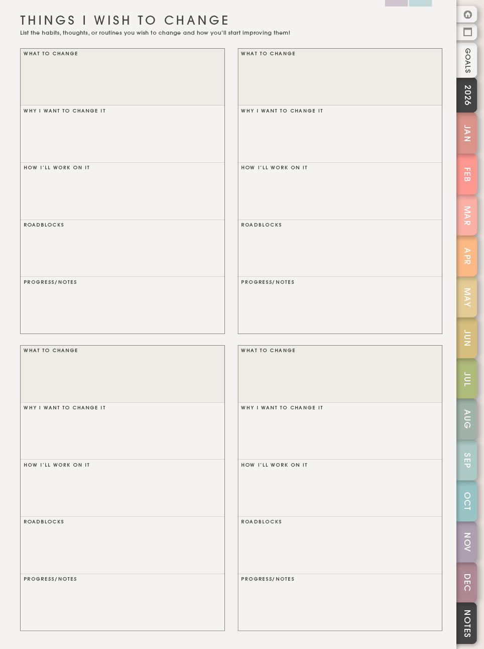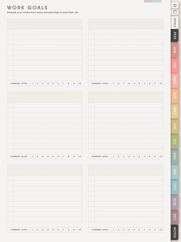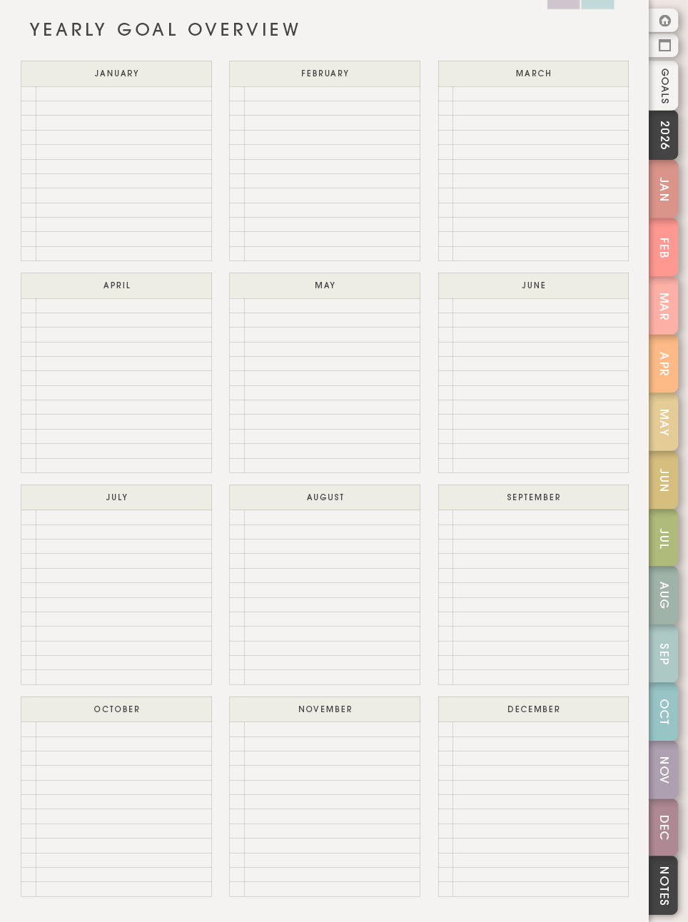 Get a bird’s-eye view of the entire year to track goals, important dates, events, and milestones. This layout helps you plan and reflect on the year’s bigger picture.
