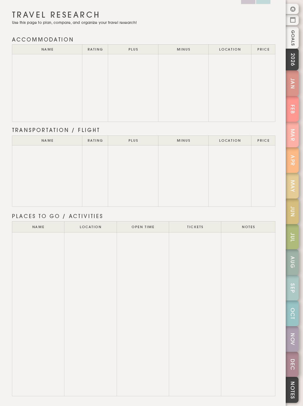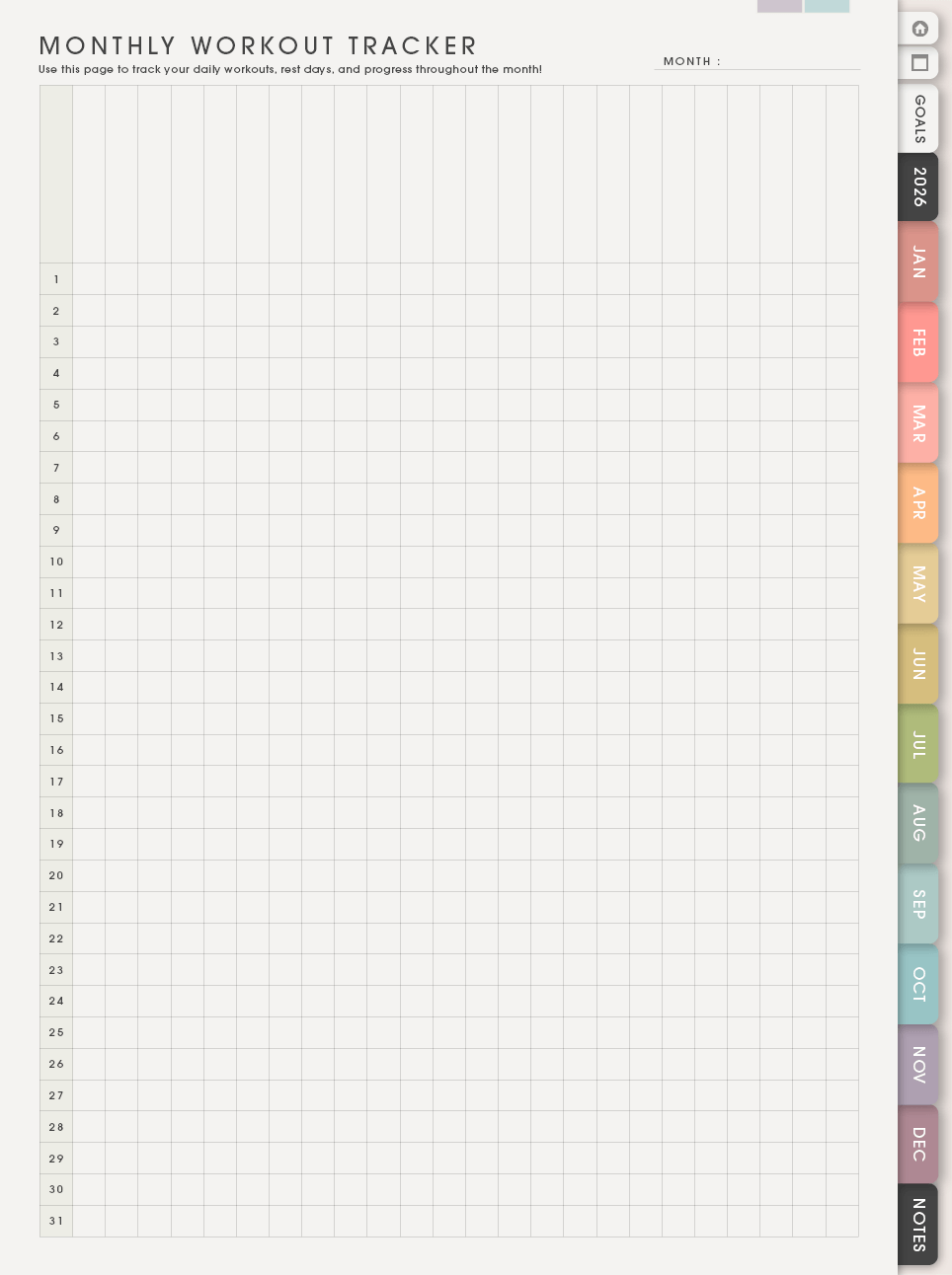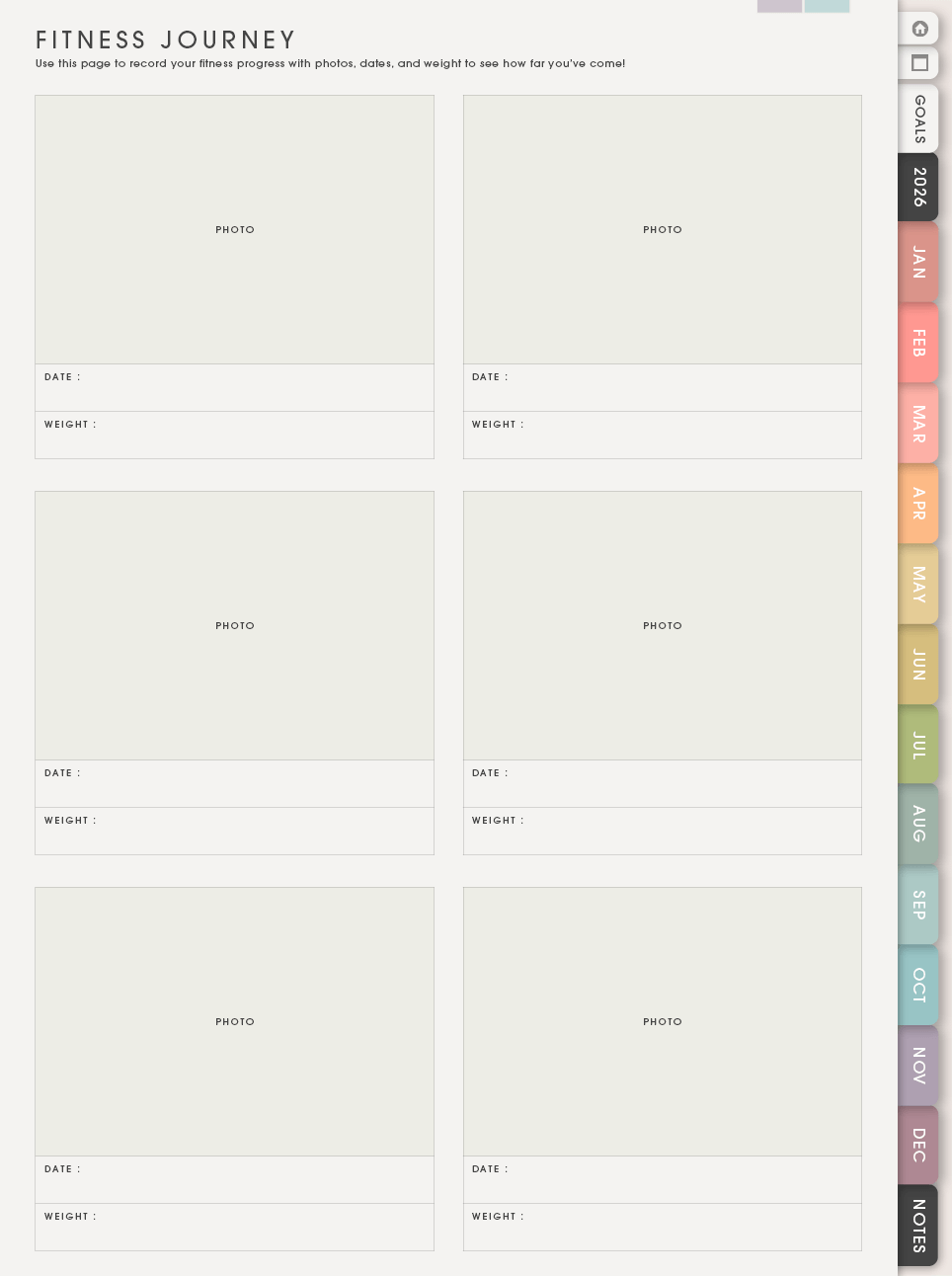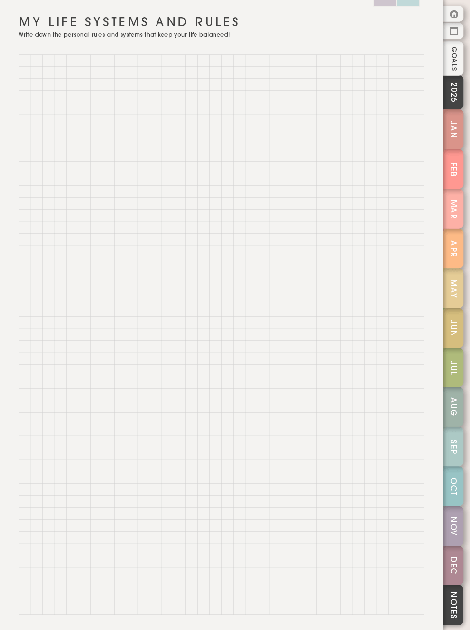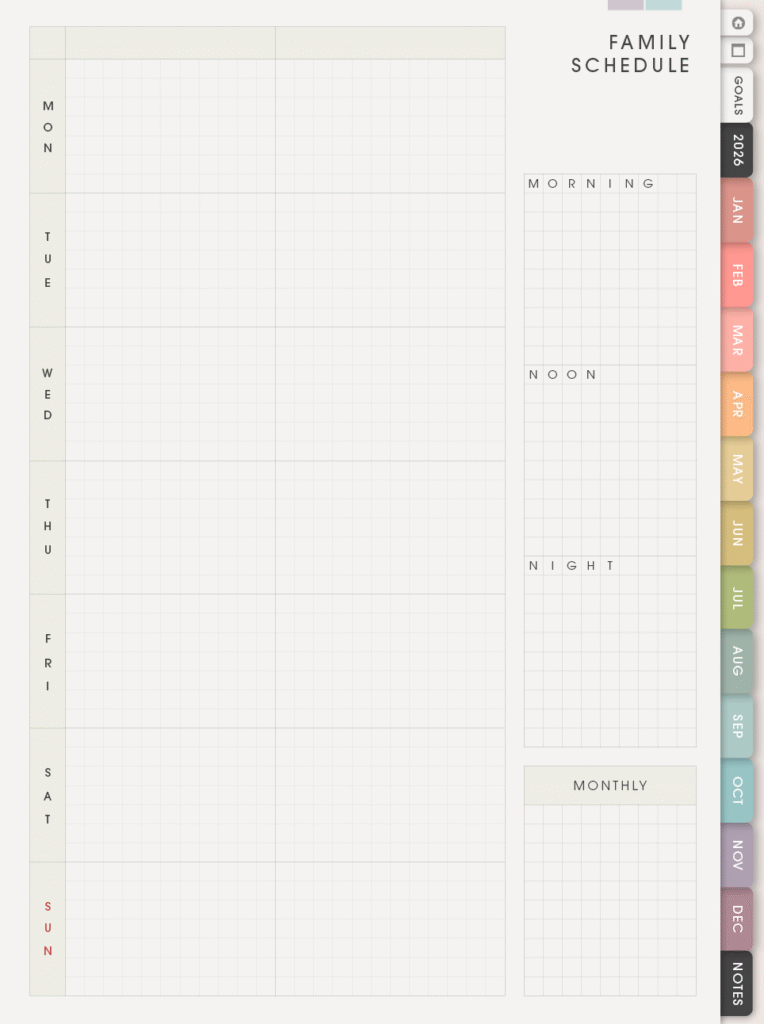 Get a bird’s-eye view of the entire year to track goals, important dates, events, and milestones. This layout helps you plan and reflect on the year’s bigger picture.