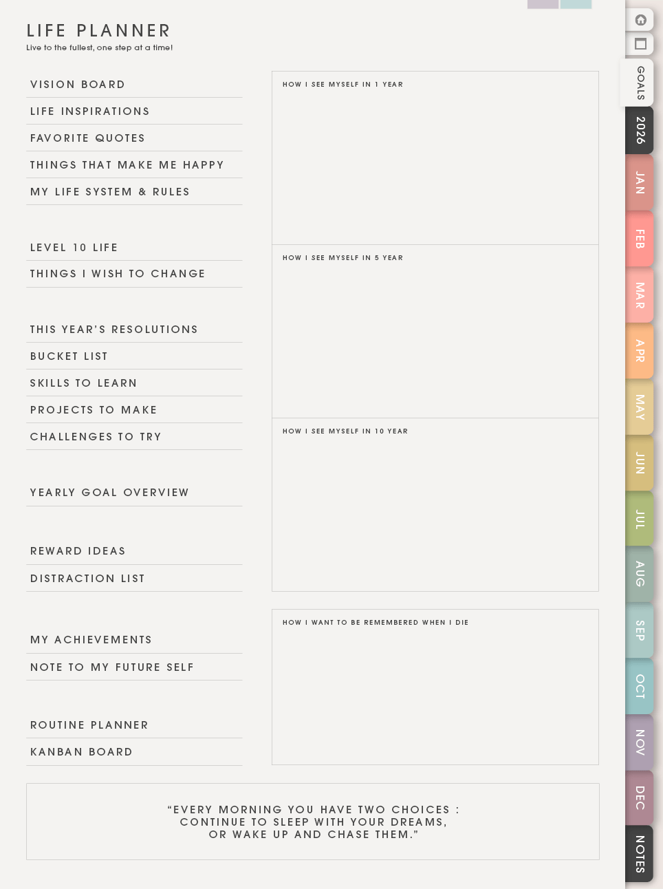 Plan your goals, dreams, and personal growth in one place. Use this page as your main index for all goal and vision pages.