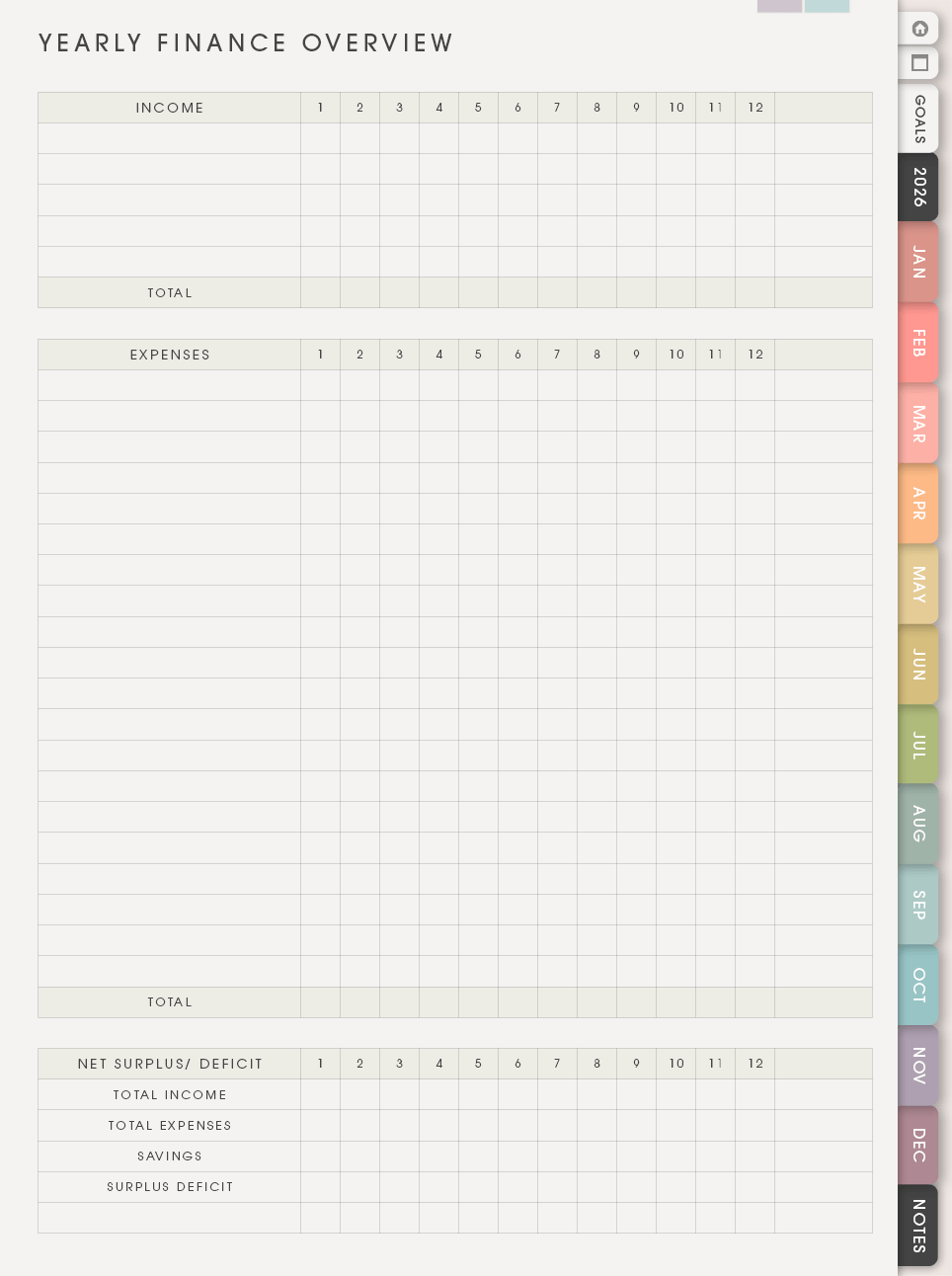 Monitor your financial health over the year by tracking income, savings, and expenses. Use this to plan budgets, set financial goals, and measure progress.