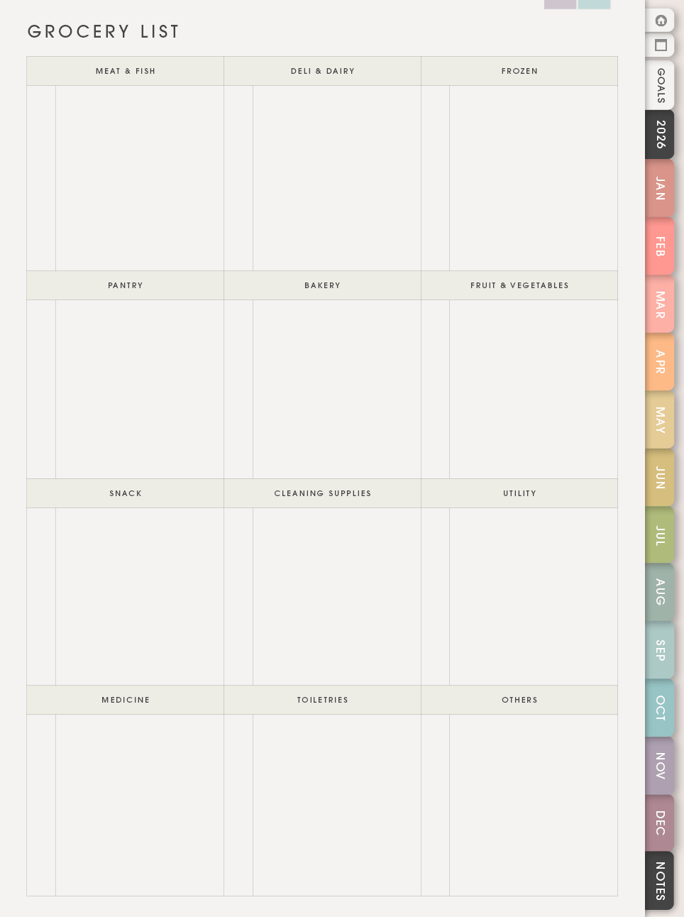 Keep a running grocery list of items you need. This section is perfect for meal prep and reducing trips to the store.