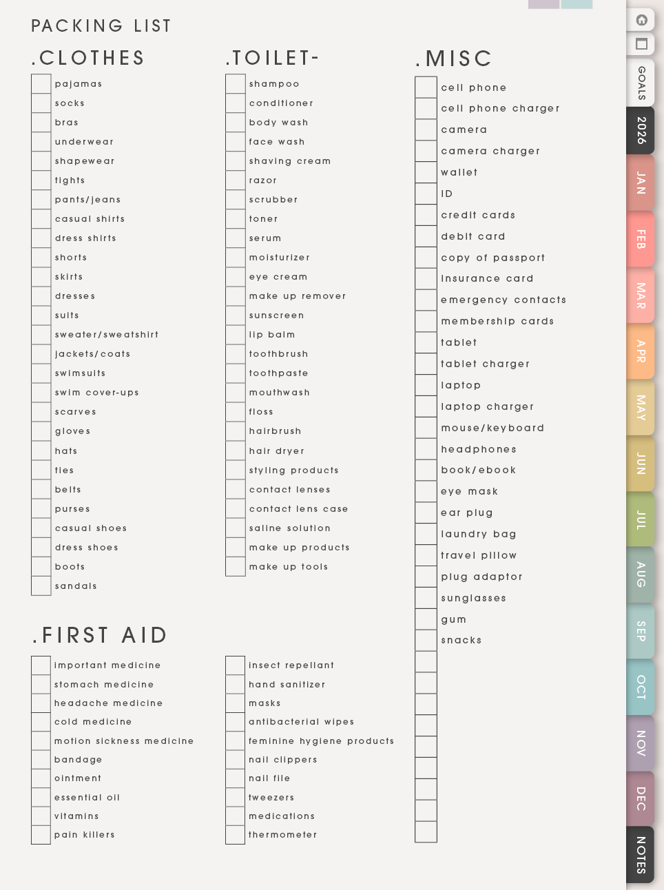 Create a list of everything you need to pack for your trips, ensuring you’re always prepared.
